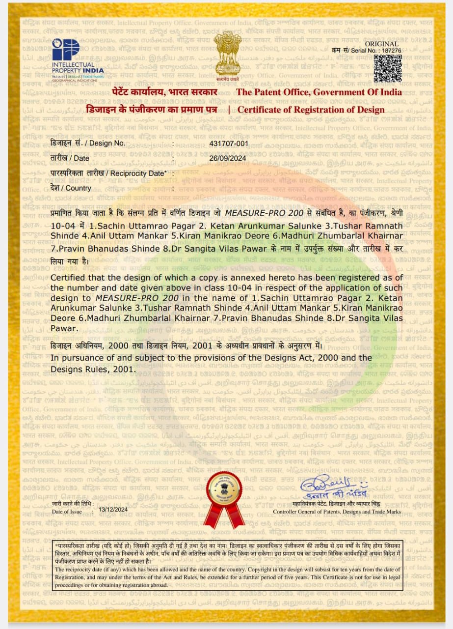 Prof. K.A.Salunke , Prof.S.U.Pagar ,Prof.T.R.Shinde , Prof.A.U.Mankar , K.M.Deore has Certified that the design of which a copy is annexed here to has been registered as of the nob & date given above in class 10-04 in respect of the application of such design to " MEASURE-PRO 200" In pursuance of and subject to the provisions of the Design Act,2000 & the Design Rules 2001 .Sr No- 187276, Design No- 431707-001,Sep-2024